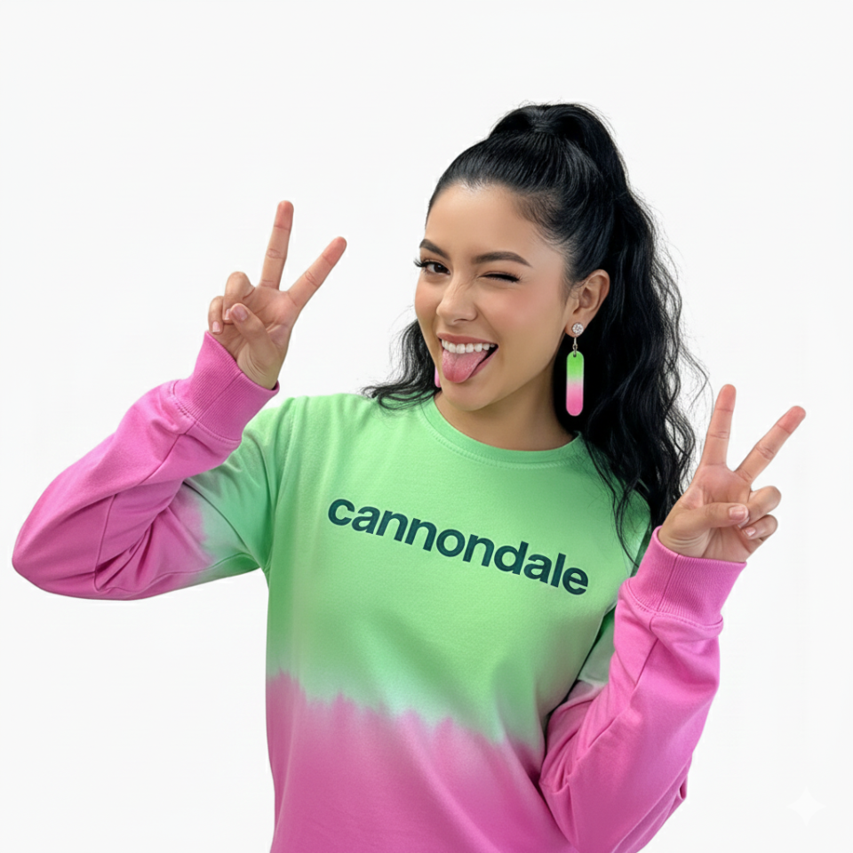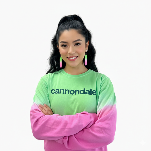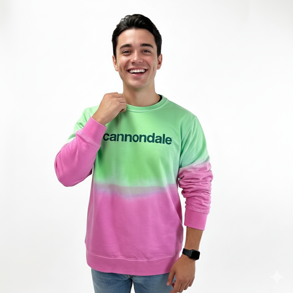 El suéter Cannondale Dipdye en tonos rosa y verde combina estilo moderno con comodidad. Confeccionado en algodón 100%, es suave, transpirable y perfecto para uso diario o como prenda casual después de entrenar. Su diseño en efecto degradado resalta la personalidad y modernidad del ciclista dentro y fuera de la ruta.